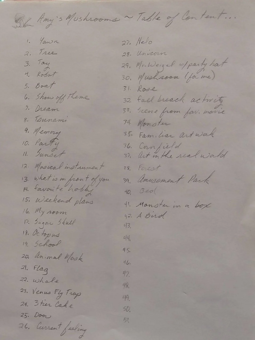 Everyday, students took turns deciding what we would draw. Our first page was a table of contents so that we would remember what the prompts were and to help us find specific drawings.